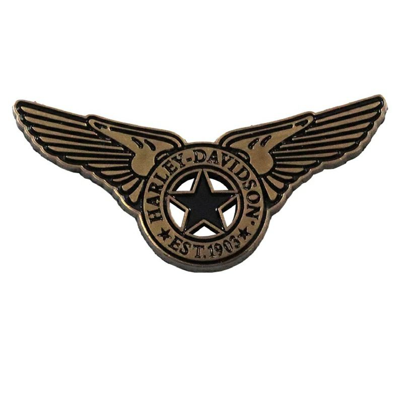 ハーレーダビッドソンの不朽のスピリットを体現する、大胆な星のエンブレムを印象的な翼で縁取った細部にまでこだわったピンバッジ。