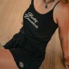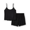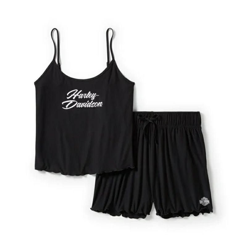 トップスのスクープネックと調節可能なスパゲッティストラップ、ショートパンツのウエストは快適なドローストリング仕様。